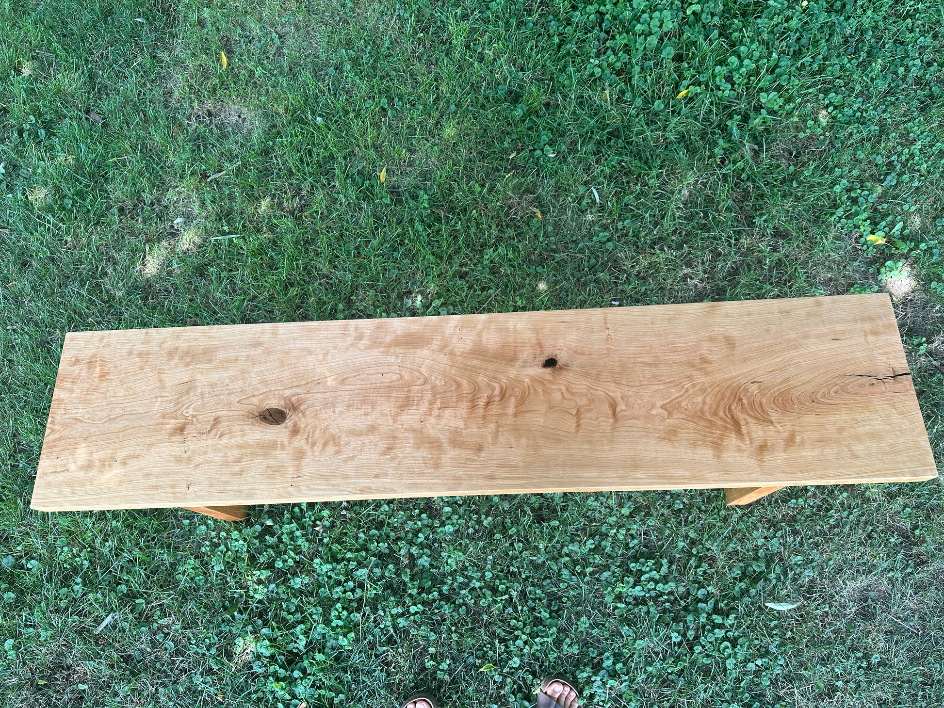 This one-of-a-kind cherry bench, is a masterful example of traditional joinery and minimalist design. Crafted entirely from a single, deep-toned slab of locally sourced cherry, its most remarkable feature was the complete absence of screws or metal fasteners.